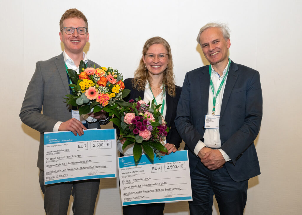 Der Hanse-Preis für Intensivmedizin 2026, gestiftet von der Fresenius-Stiftung Bad Homburg, ging erneut an zwei Gewinner:innen. Dr. med. Theresa Tenge, Universitätsklinikum Düsseldorf, überzeugte die Jury mit dem Vortrag zu ihrer Arbeit: „Development and validation of a prediction score for early identification of palliative care needs for patients in the intensive care unit: a multicentre retrospective cohort study“. Dr. med. Simon Hirschberger, LMU Klinikum München, wurde für seinen Vortrag zur Arbeit „Mitochondrial damage drives T-cell immunometabolic paralysis after major surgery“ ebenfalls der Hanse-Preis für Intensivmedizin 2026 verliehen.